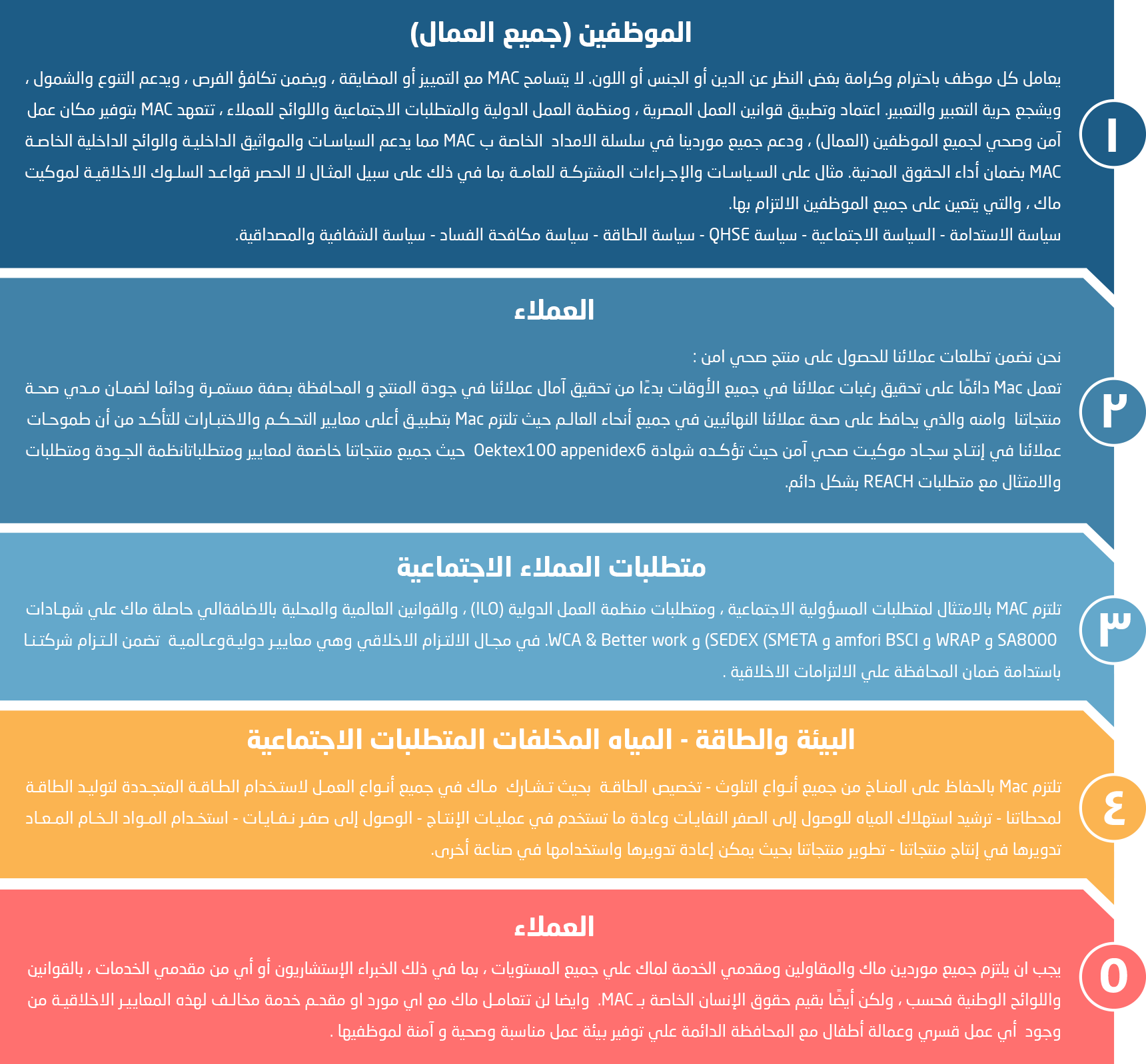 إن جميع اللوائح وقواعد العمل لدينا فى شركة ماك قد وضعت لتجعل بيئة العمل فى أعلى درجات التطابق مع قوانين منظمة العمل الدوليه وجميع القوانين التى تحكم علاقة العمل بيننا وبين جميع أصحاب المصالح الداخليين والخارجيين.